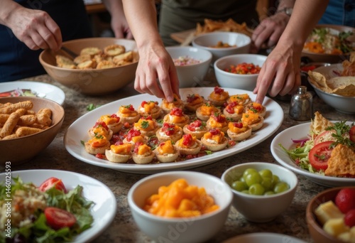 A vibrant spread of appetizers featuring colorful canapés and fresh salads