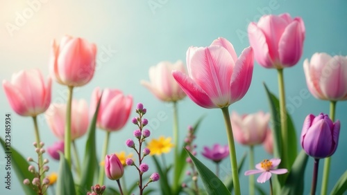 A vibrant spring garden showcasing delicate pink and purple tulips in full bloom, complemented by smaller wildflowers, bathed in soft sunlight against a serene pastel backdrop.