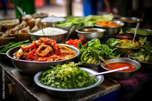 A vibrant street food stall in Thailand specializing in the preparation and sale of traditional Khanom Bueang, beautifully garnished with colorful toppings