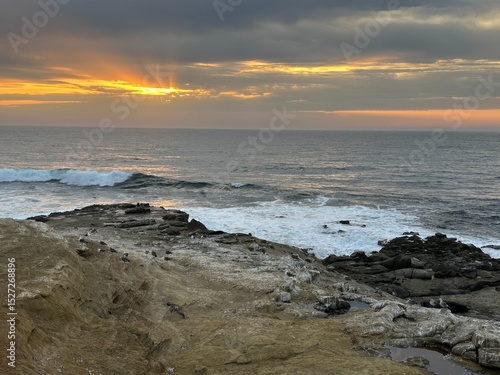 A vibrant sunset at Point La Jolla, California, features brilliant sun rays, with birds and sea lions peacefully resting on sun-kissed coastal rocks.