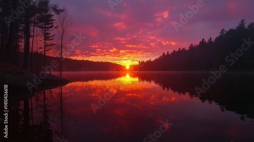 A vibrant sunset over a tranquil lake reflects its colors