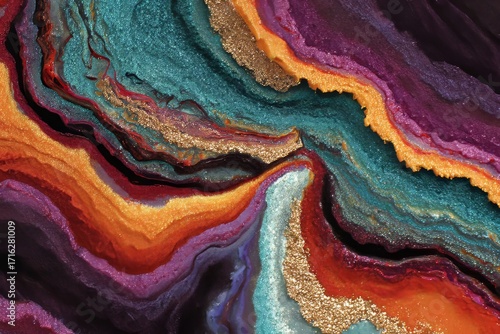 A vibrant, textured design showcasing layered, flowing colors and flecks of gold, evoking a sense of depth and movement.