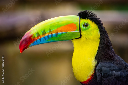 A vibrant toucan showcases its colorful bill in the lush surroundings of Ukumarí Park, Pereira, Risaralda, Colombia.
