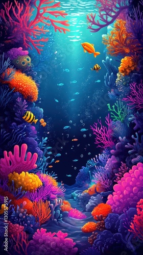 underwater, coral, reef, fish, ocean, marin, sea, water, blue, colourful, vibrant, aquatic, life, nature, illustration, art, background, scene, depth, sunlight, bubble, small, bright, purple, pink, orange, yellow, red, fauna, environment, ecosystem, diverse, abstract, structure, growth, branching, flourishing, habitat, illuminated, light, tranquil, movement, school, swimming, below, artistic, decorative