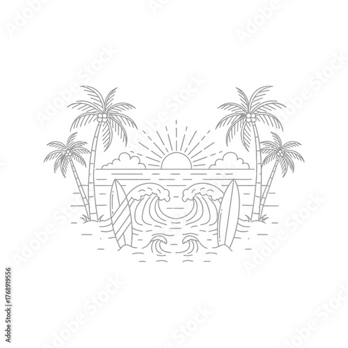 A vibrant vector illustration of a tropical beach landscape with palm trees and the ocean under a summer sky