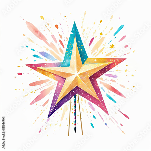 A vibrant watercolor painting of a starburst, perfect for adding a touch of magic to your holiday designs. This colorful star is sure to bring joy and sparkle to any project.