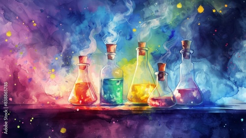 A vibrant watercolor painting of colorful laboratory flasks with smoke. The dynamic mix of colors creates an artistic science-themed backdrop.