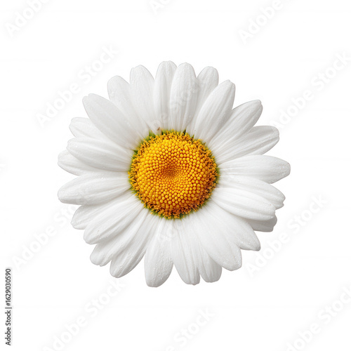 A vibrant white daisy with a bright yellow center, showcasing intricate petal details against a white isolated background. Perfect for nature-themed designs.