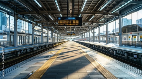 ai, japan, train, station, platform, empty, railway, track, signs, japanese, city, urban, city landscape, sunlight, shadow, morning, day, quiet, deserted, architecture, transportation, public, commuter, travel, journey, modern, clean, concrete, steel, glasses, window, building, structure, overhead, light, rail, line, hub, perspective, abandoned, desolate, neglected, track, decay, infrastructure, old, vintage, rusted, ghostly