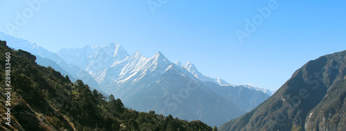 A view from afar on a snowy Kusum Kanguru mountain peaks in Himalayas in Sagarmatha national park in Nepal. Nature, outdoors, healthy lifestyle, beauty in nature, travel and tourism concept.