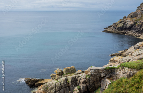 A view from the cliff top down towards the Minack Theatre near Porthcurno on the South Coast of Cornwall, England UK