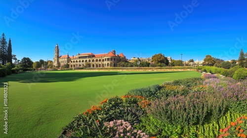 building, garden, landscape, tower, architecture, greenery, lawn, flower, sky, university, structure, park, vegetation, history, urban, design, academic, southern, sunny, vibrant, botanical, facades, scenic, educational