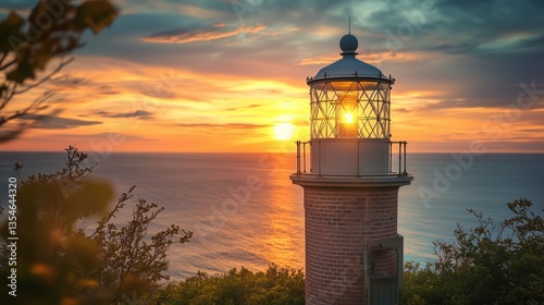 A vintage brick lighthouse with a classic glass lantern room, warm light glowing as the sun sets in the background