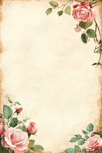 A vintage-style floral frame with pink roses and green leaves on an aged paper background, ideal for invitations, cards, or romantic designs