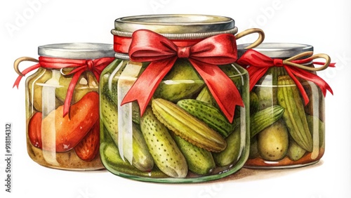 A vintage-style illustration of a clear glass jar filled with green pickles and adorned with a red ribbon, set against a white background.