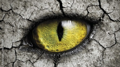 A viper's piercing yellow eye with a striking black vertical pupil stares intensely from a cracked stone surface