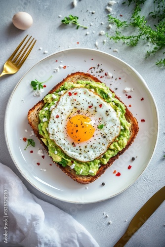 A visually appealing avocado toast topped with a beautifully fried egg and seasoning on a stylish plate for brunch.