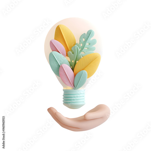 A visually striking 3D rendering of a light bulb with a leafy nature inspired interior floating above a caring hand in soothing pastel tones a symbol of renewable energy and innovative