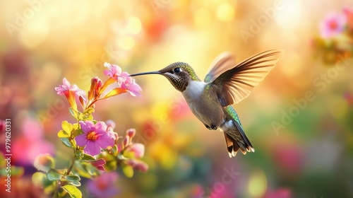 A vivid hummingbird gracefully hovers near colorful flowers, showcasing its iridescent feathers in a dreamy garden setting.