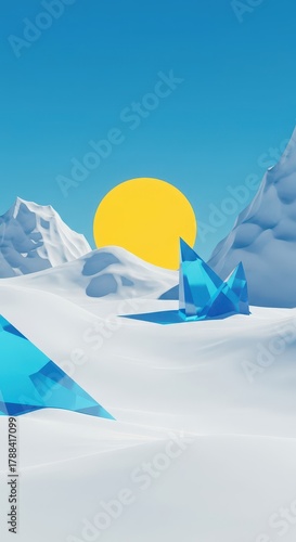 stylised, graphic, high-coloured, form, contemporary, contrast, seasonal, shape, crystal, sharp, arctic, structure, white, modern, abstract, sun, minimalist, scene, horizon, blue, design, peak, glacé, yellow, polygonal, angular, ice, composition, bright, nature, environment, background, geometric, snow, cold, landscape, winter, mountain