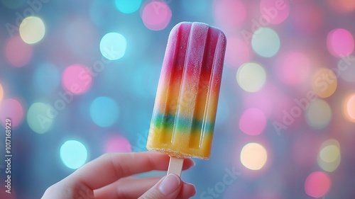 A vividly colored ice cream popsicle is displayed in a hand, set against a captivating bokeh background. This image captures the essence of summer treats and visual delight.