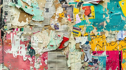 wall, paper, poster, torn, weathered, faded, peeling, layer, texture, abstract, urban, city, street, art, graffiti, colours, yellow, pink, green, blue, red, orange, brown, white, black, grunge, vintage, distressed, collage, chaotic, messy, rough, surface, background, design