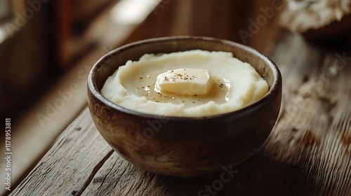 A warm bowl of creamy mashed potatoes with a dollop of butter resting on a rustic wooden table