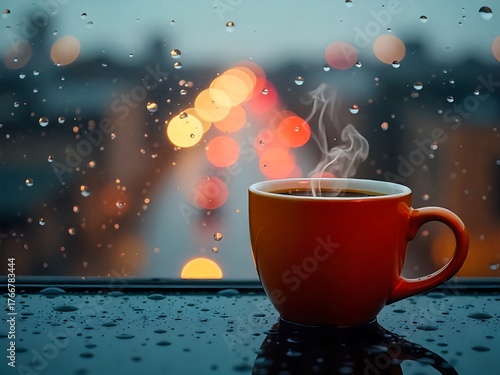 a warm cup of coffee on a rainy day, with the cityscape blurred in the background and raindrops on the glass.