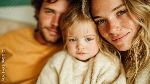 A warm family portrait featuring a couple with their child, showcasing affection and togetherness, captured in a cozy setting with natural light and soft expressions.