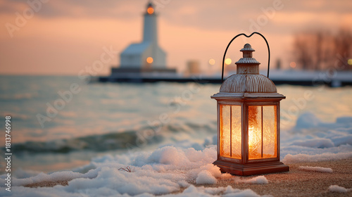 A warm lantern sits on a snowy beach, illuminating the winter scene. In the background, a lighthouse stands guard against the soft sunset, creating a peaceful, frosty coastal ambiance
