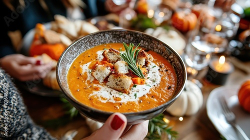 soup, bowl, garnished, autumn, table, setting, harvest, warmth, texture, warm, comfort, nourishment, welcome, tradition, gathering, delight, rustic, vibrant, festive, modern, culinary, dish, nourishment, decorative, meal, serving, seasonal, celebration, ingredient, presentation, hospitality, plentiful, cosy, fresh, cheerful, inviting, colourful, gastronomy, delicious, homelike, photo, contemporary, wintery