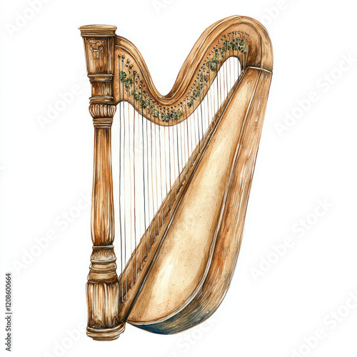 harp, gold, musical, instrument, watercolor, st, patrick, day, celebration, high, quality, detailed, isolated, white, background, commercial, use, traditional, art, design, decoration, festive, culture, ireland, string