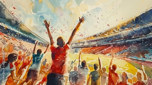 A watercolor masterpiece captures the electrifying atmosphere of a packed Olympic stadium. A vibrant wash of colors depicts the sea of spectators