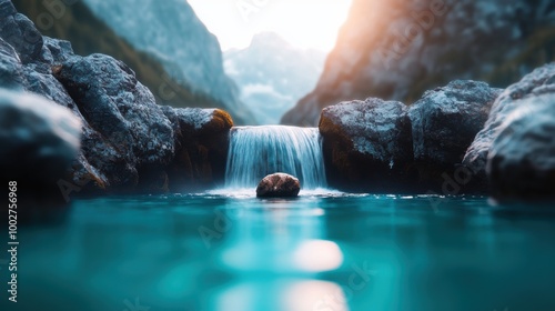 A waterfall cascading down a mountainside, its water shimmering with a thousand different colors and emitting a soft, mystical glow.