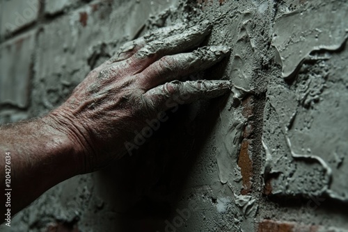 A weathered hand applies grey mortar to a brick wall, showcasing the texture and process of construction.
