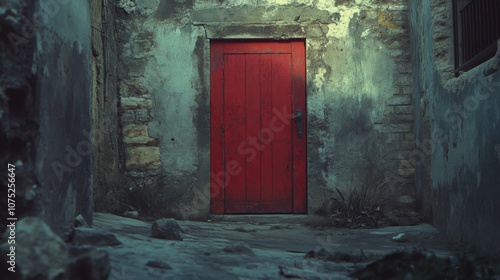 red door, stone wall, mystery, intrigue, decay, contrast, forgotten, abandoned, old building, history, architecture, rustic, weathered, enigmatic, doorway, aged, texture, historical, charme, hidden, secret, patina, adventure, vintage, antiquity, alley, nostalgia, exploration, timeless, atmosphere, urban, storytelling, allure, concealed, solitude, urban decay, composition, character, unique, past, memory