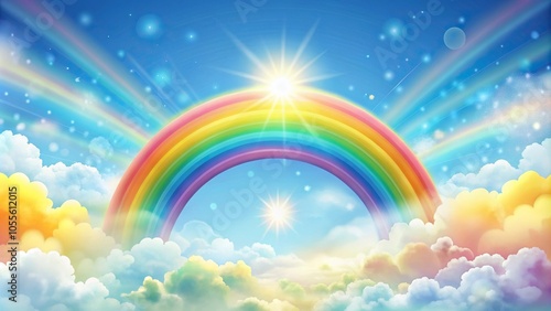 A whimsical and playful rainbow-themed wallpaper featuring fluffy clouds and sunshine, happy atmosphere, soft textures