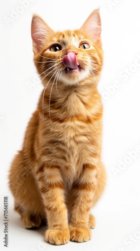 a whimsical ginger cat with its tongue sticking out, on a white background, pet care with copy space for text