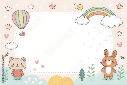 a whimsical illustration featuring a rainbow, clouds, a hot air balloon, and cute animal characters. The central space is perfect for text or design elements.
