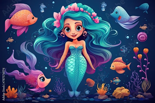 mermaid, animation, cartoon, character, illustration, three-dimensional, fiction, mascot, fairy tale, scarey, silhouette, game, motion picture, crown, whimsical, character, fantasy, underwater, aquatic, fairy tale, folklore, ocean, princess, magical, marin, beautiful, enchanting, mythical, tail, fin, creature, marine life, tiara, coral, seashell, seaweed, whimsy, childhood, storybook, mythology, blue, oceanic, generative