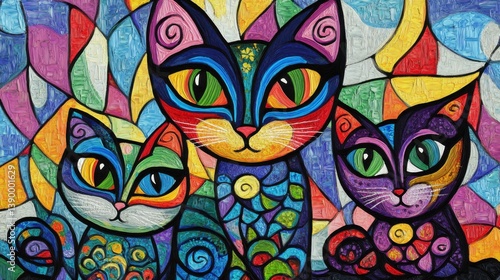 A whimsical stock image featuring three abstract cats in vibrant colors and patterns. The image conveys a sense of creativity, artistic design, and the beauty of feline art,