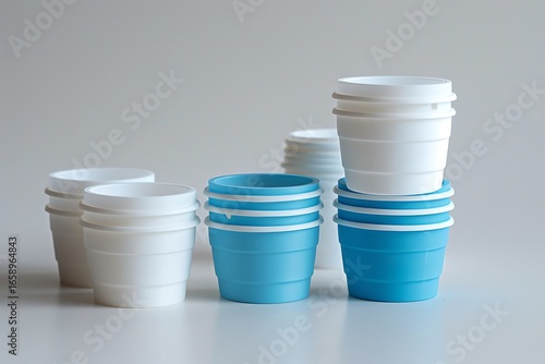 A white and blue plastic disposable glass stacking