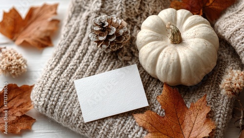 A white blank card rests on a cozy beige knit sweater amidst autumn leaves, a small white pumpkin, and pine cones