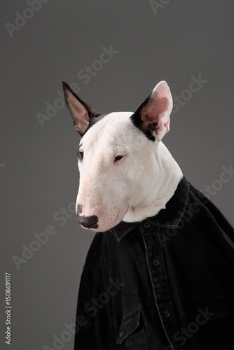 bull, terrier, dog, white, black, shirt, grey, background, plain, studio, lighting, stylish, elegant, calm, domestic, animal, pet, companion, whisker, fur, texture, sharpened, photo, pose, portrait, bright, unique, neutral, sophisticated, distinguished, clean