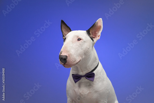 A white Bull Terrier wearing a bow tie is looking at the camera against a solid blue background