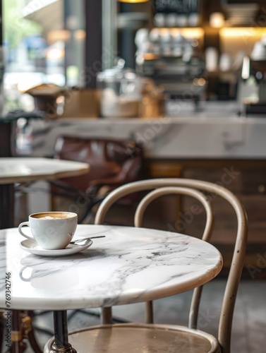 A white coffee cup sits on a table in a cafe