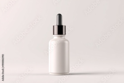 A white cosmetic serum bottle with a black pipette dropper stands upright against a clean, light backdrop