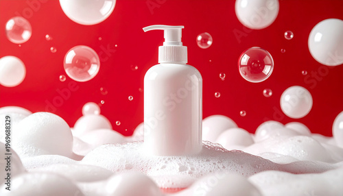 A white pump bottle stands in a sea of foam and bubbles against a vibrant red background, suggesting cleanliness and skincare.