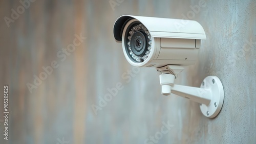 A white security camera is mounted on a wall