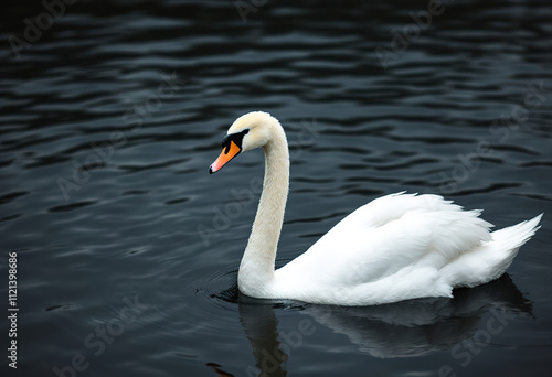 A white swan swimming in a dark body of water